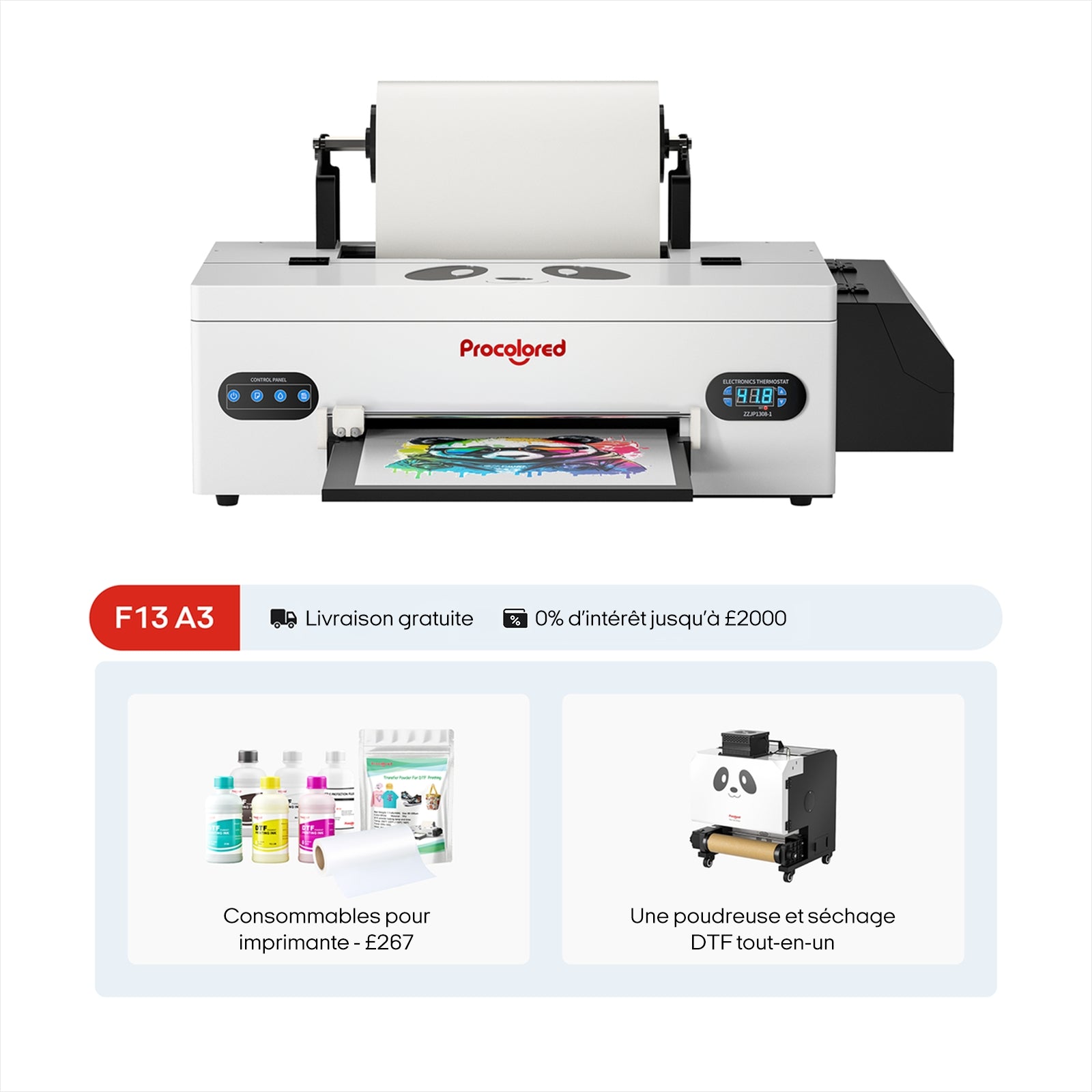 Imprimante DTF Procolored F13 Panda 13" A3 L1800 & Pack avec poudreuse
