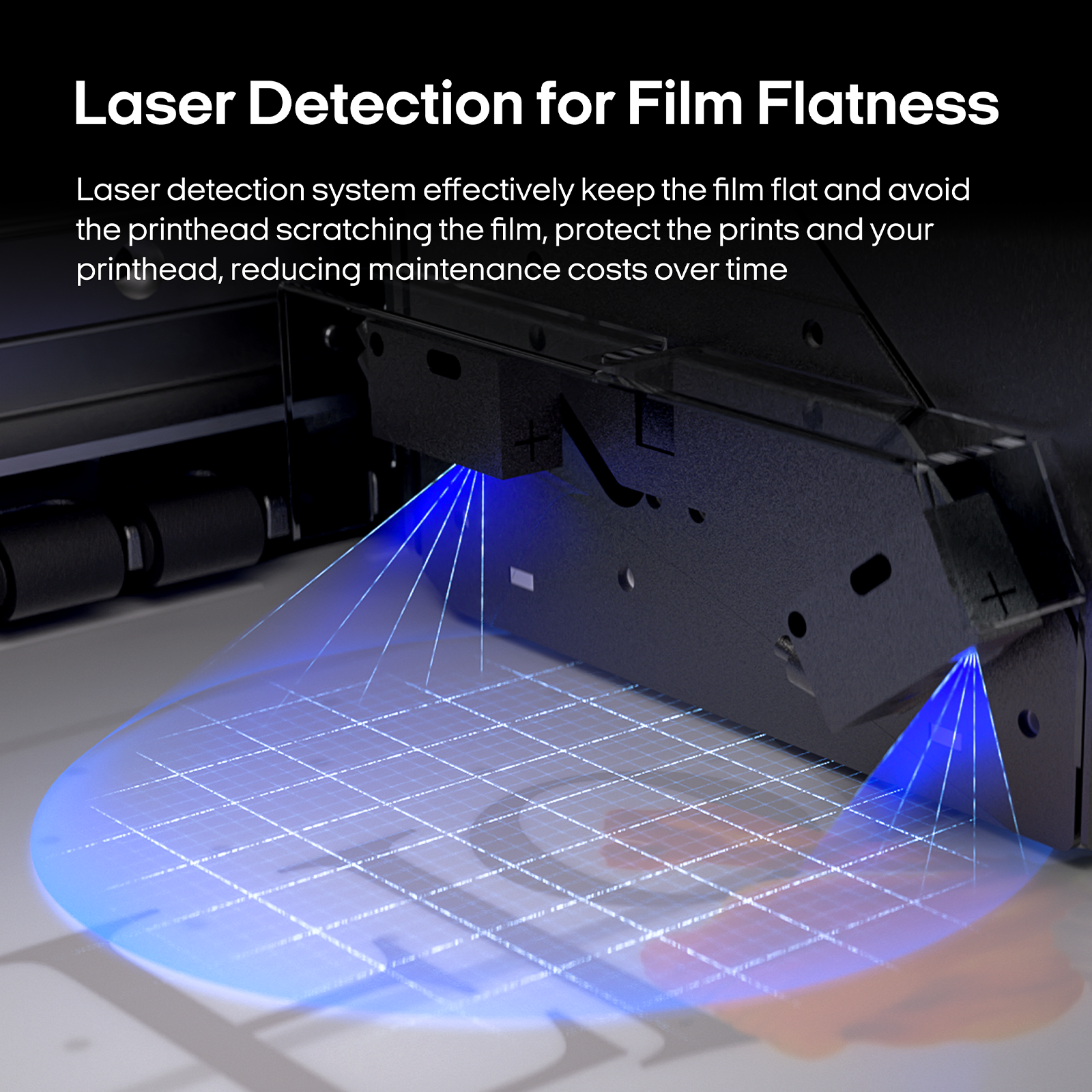 Système de détection laser - Le système de détection laser permet de maintenir efficacement la planéité du film, d'éviter que la tête d'impression ne raye le film, de protéger les impressions et la tête d'impression, et de réduire les coûts de maintenance à long terme.