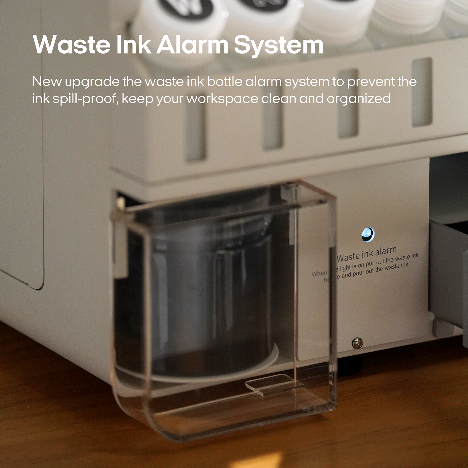 Système d'alerte d'encre usagées - Le nouveau système d'alerte pour les bouteilles d'encre usagées empêche les débordements d'encre et maintient un environnement de travail propre et ordonné.